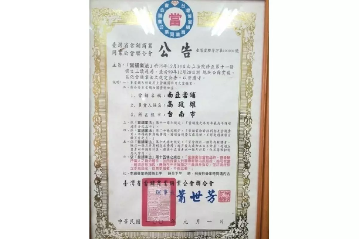 在資金週轉的關鍵時刻,選擇一家合法、透明、誠信的當舖至關重要!南亞當舖經政府立案,堅持以正派經營為核心,提供專業、安全、迅速的借貸服務,讓您在急需資金時獲得最可靠的支持。我們深知每位客戶的需求不同,因此量身打造彈性的借款方案,確保借貸過程順利且無壓力。