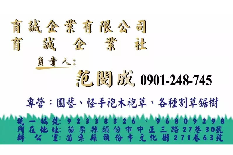 育誠企業有限公司/育誠企業社憑藉多年來在園藝工程方面的豐富經驗,致力於為客戶提供最優質的服務。公司自成立以來,始終堅持以誠信為本、服務至上的經營理念,贏得了廣大客戶的信任和好評。